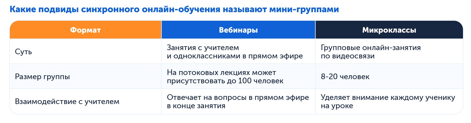Но и это ещё не всё. В синхронном формате легко запутаться в подвидах, разные онлайн-школы называют их по-разному: микроклассы, мини-группы, вебинары. Интуитивно понятно, о чём речь, но на самом деле есть нюансы. Сложнее всего с мини-группами: одни называют так потоковые вебинары на 100 человек, другие — занятия в небольших группах, где учитель может уделить внимание каждому ученику.