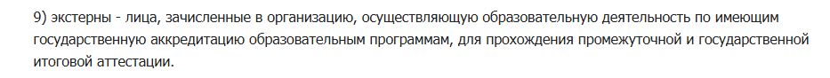 С юридической точки зрения экстерн — это ученик, зачисленный в образовательную организацию только для прохождения промежуточной и государственной итоговой аттестации.
