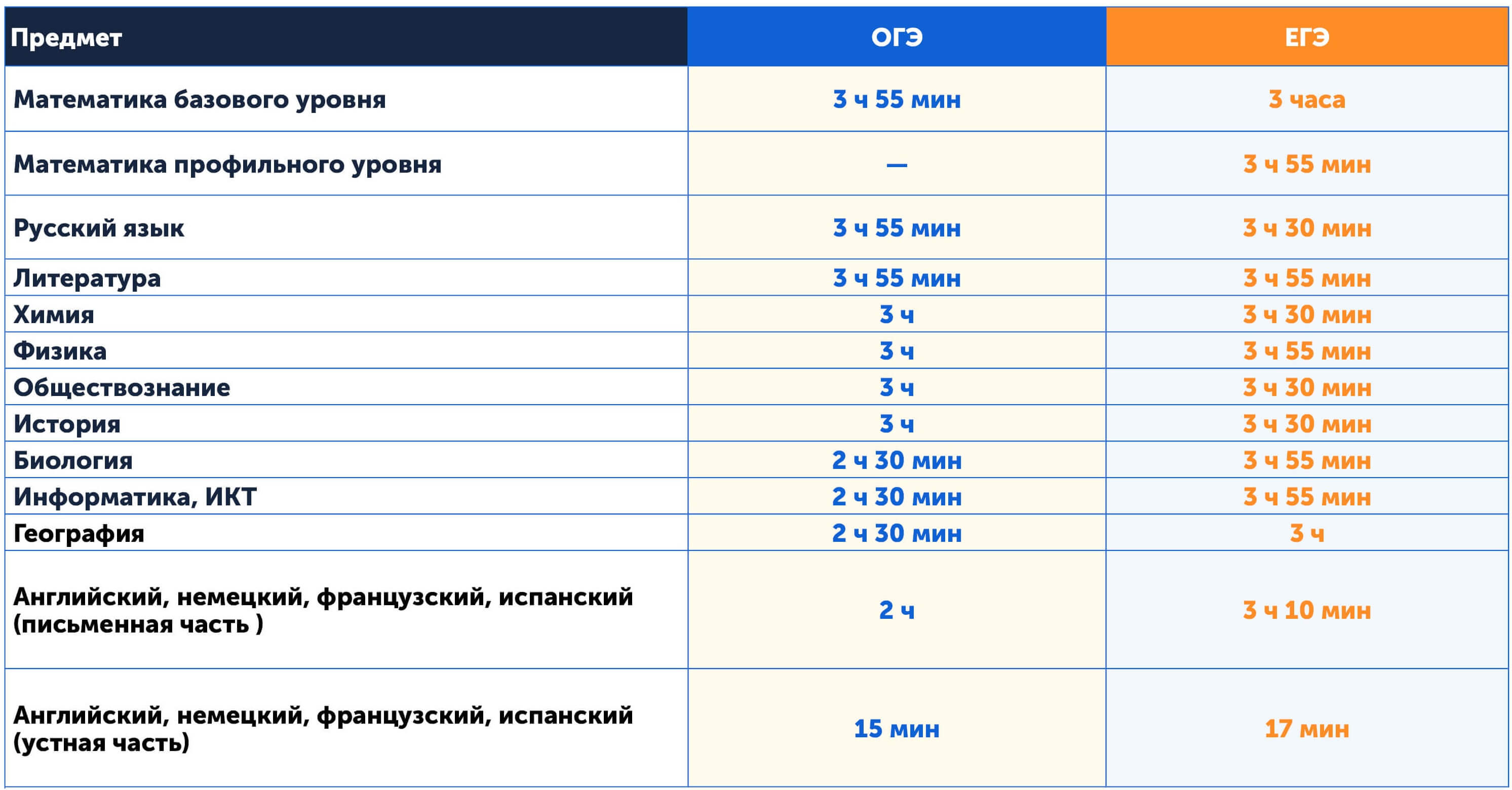 При этом каждый экзамен занимает разное время. В нашей таблице мы собрали главные отличия.